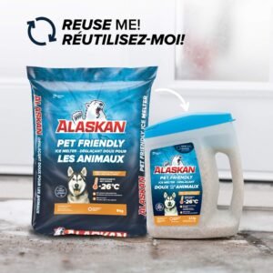 Because your furry friend deserves the best, this product has been developped in collaboration with a veterinarian to combine performance and safety. Its exclusive formula contains a hydrating agent that keeps paw pads from drying and prevents lesions. And this, without compromising results. Your safety and that of your whole family comes first. Without exception. Alaskan Pet Friendly Ice Melter is offered in an ergonomic spreader jug that protects the product from humidity, so it can be applied easily. It is reusable, recyclable and environment-friendly.