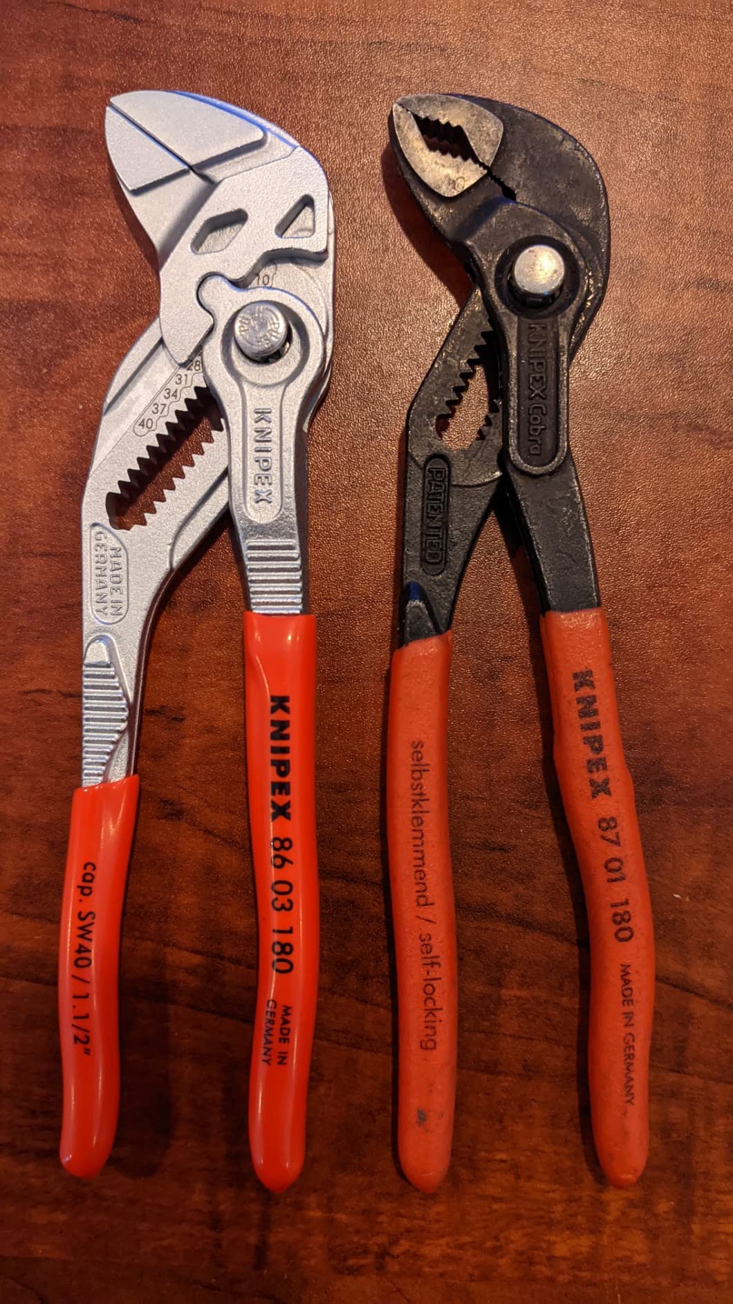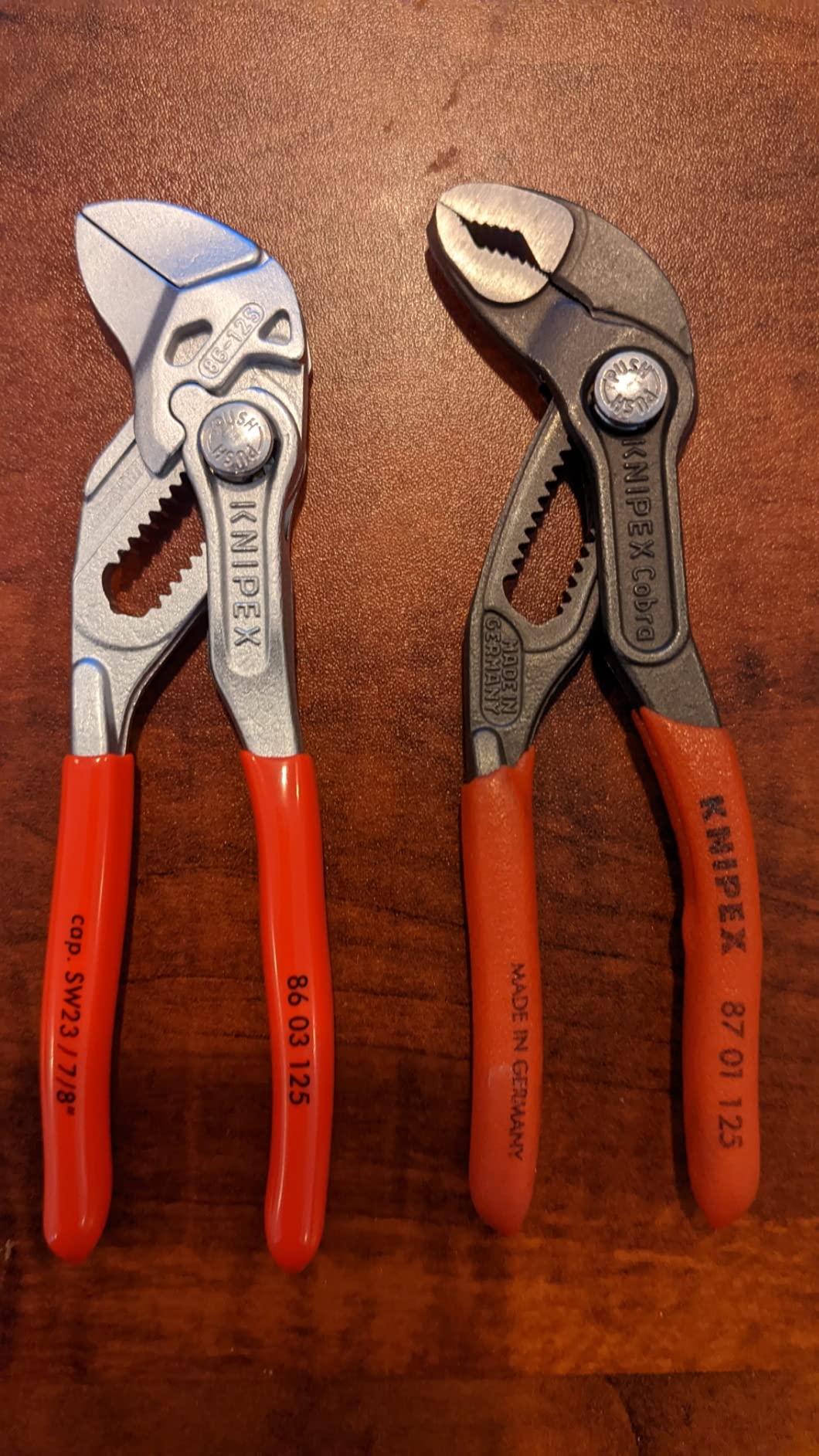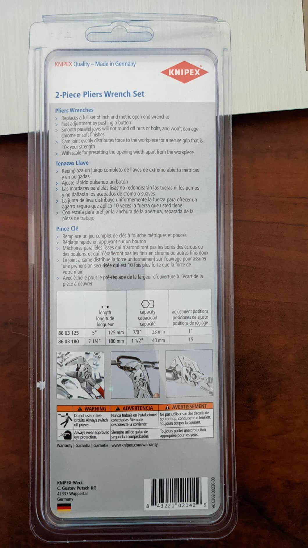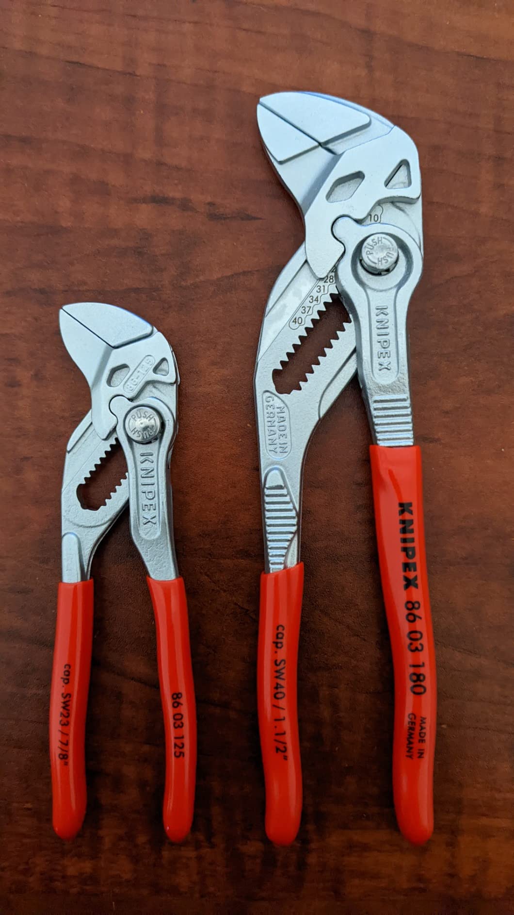 Knipex 9K 00 80 121 US features pliers wrench models 86 03 125 and 86 03 180. The 86 03 125 is 5-inches long with 11 adjustment positions, making it a mini yet mighty tool. It is ideal for every-day-carry (EDC) kits and also for precision mechanics and access to confined spaces. The 86 03 180 is 7 1/4-inches long with 13 adjustment positions and features narrow gripping jaws for fastening/loosening situations that require a slim tool. The 86 03 125 has capacity for nuts up to 7/8-inch and the 86 03 180 has capacity for nuts up to 1 3/8-inch.