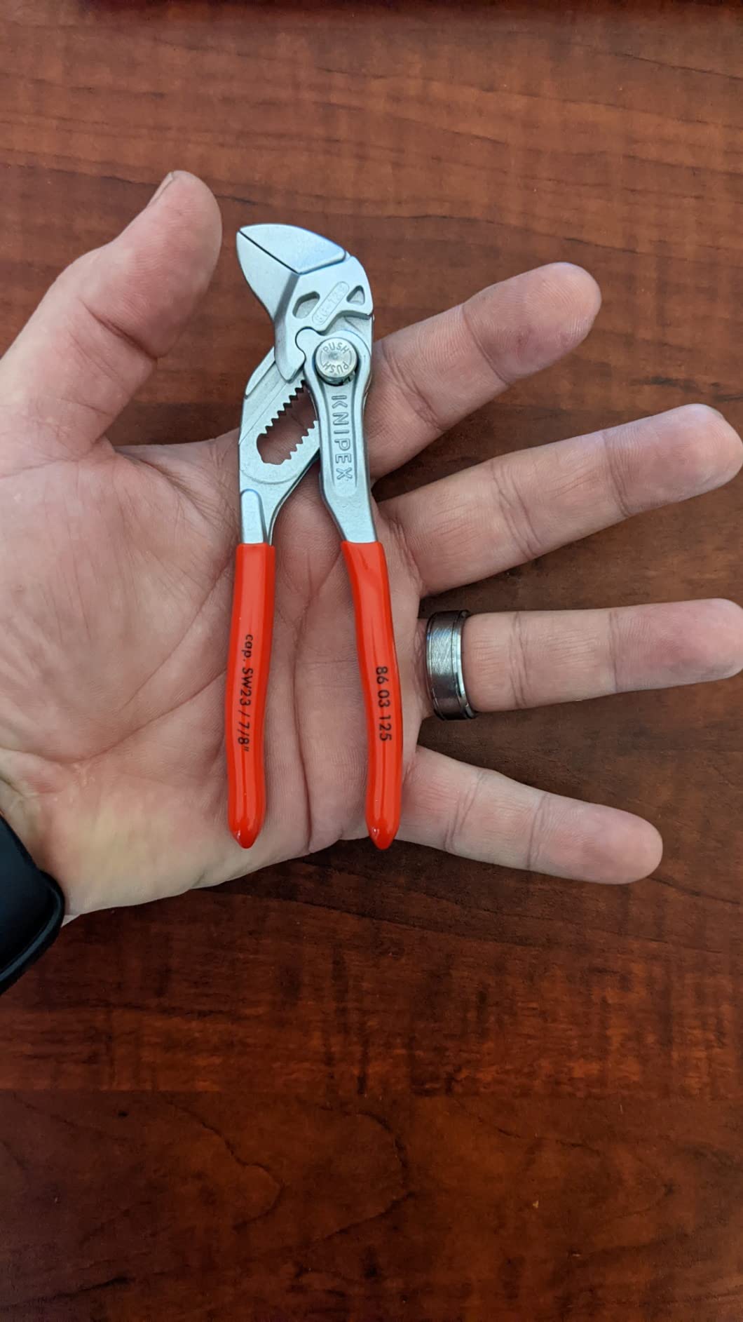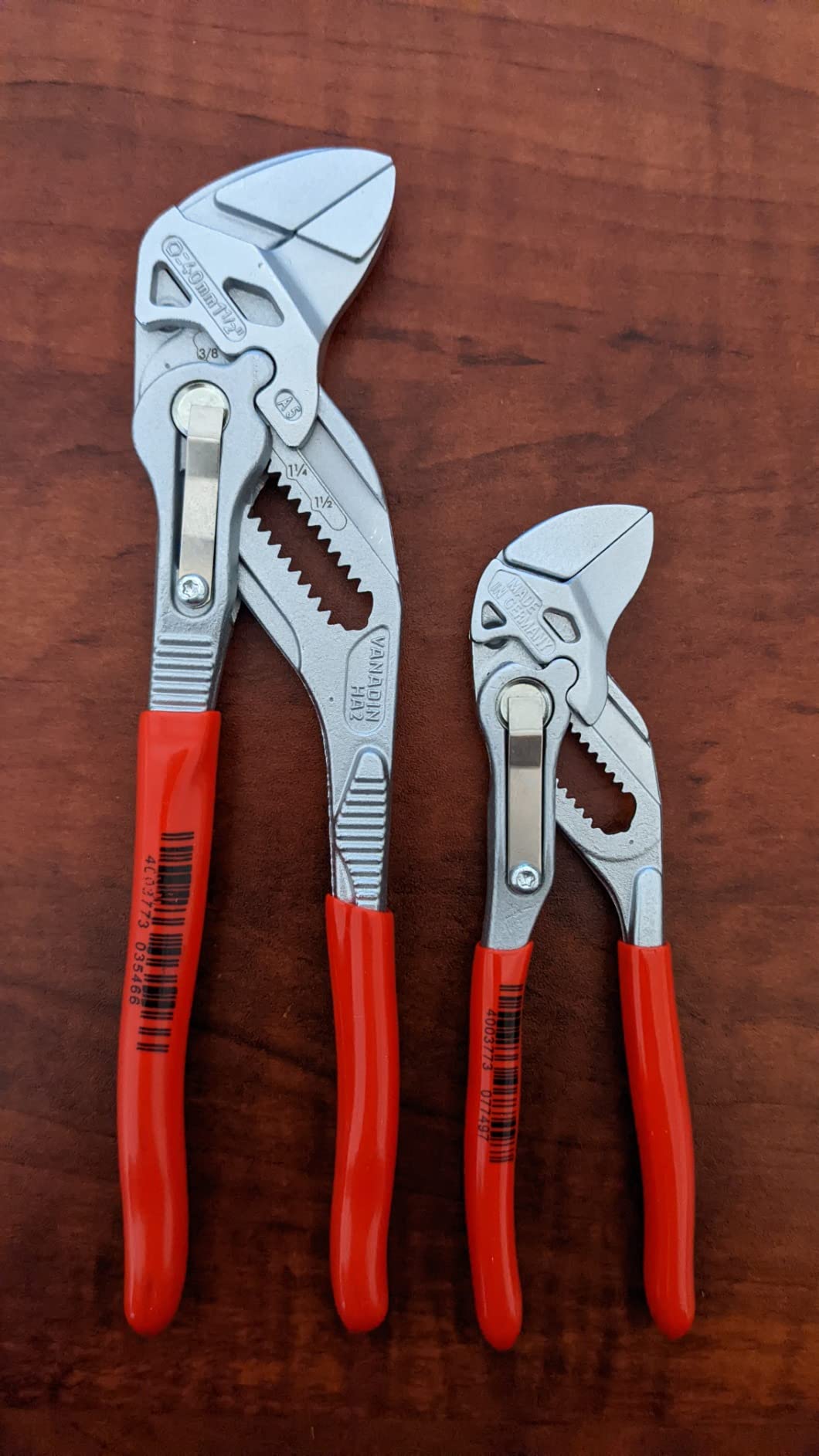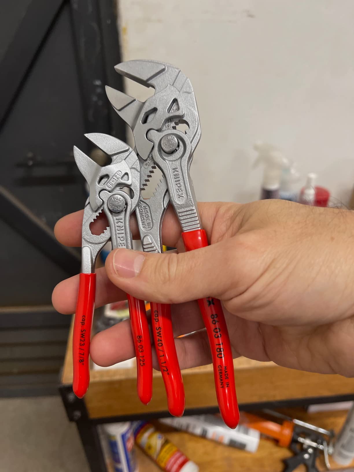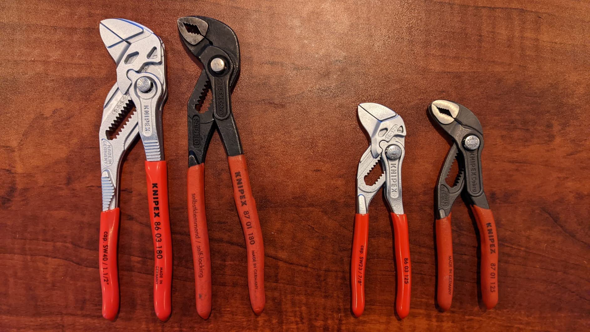 Knipex 9K 00 80 121 US features pliers wrench models 86 03 125 and 86 03 180. The 86 03 125 is 5-inches long with 11 adjustment positions, making it a mini yet mighty tool. It is ideal for every-day-carry (EDC) kits and also for precision mechanics and access to confined spaces. The 86 03 180 is 7 1/4-inches long with 13 adjustment positions and features narrow gripping jaws for fastening/loosening situations that require a slim tool. The 86 03 125 has capacity for nuts up to 7/8-inch and the 86 03 180 has capacity for nuts up to 1 3/8-inch.