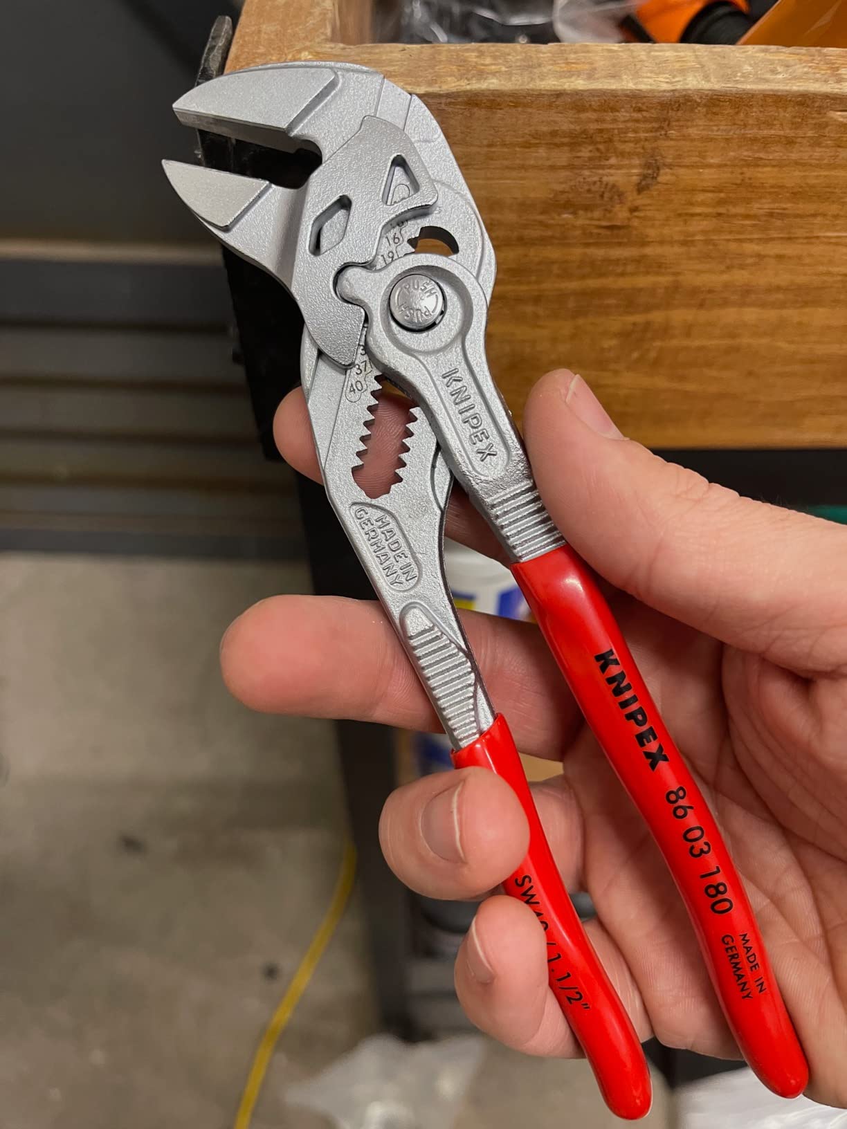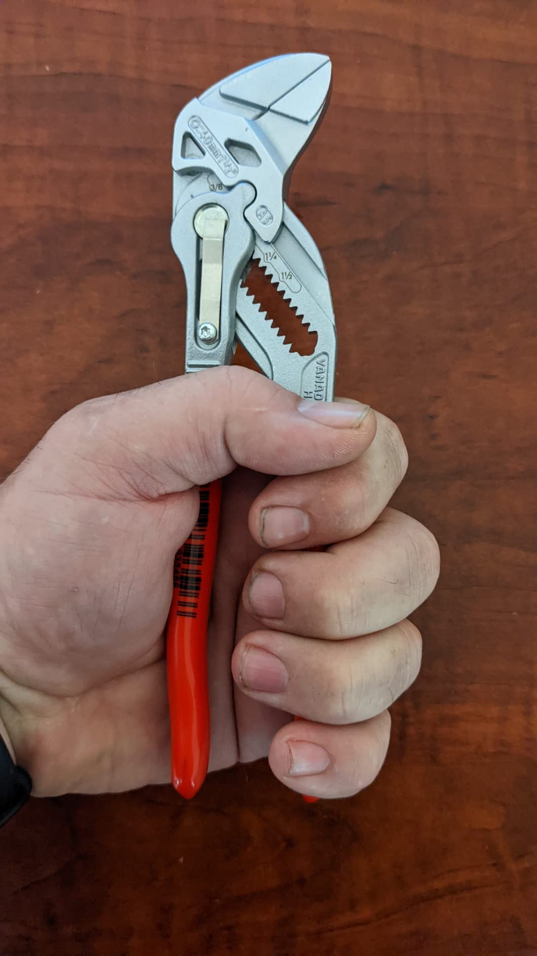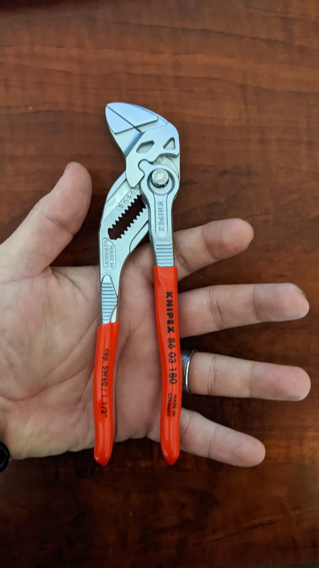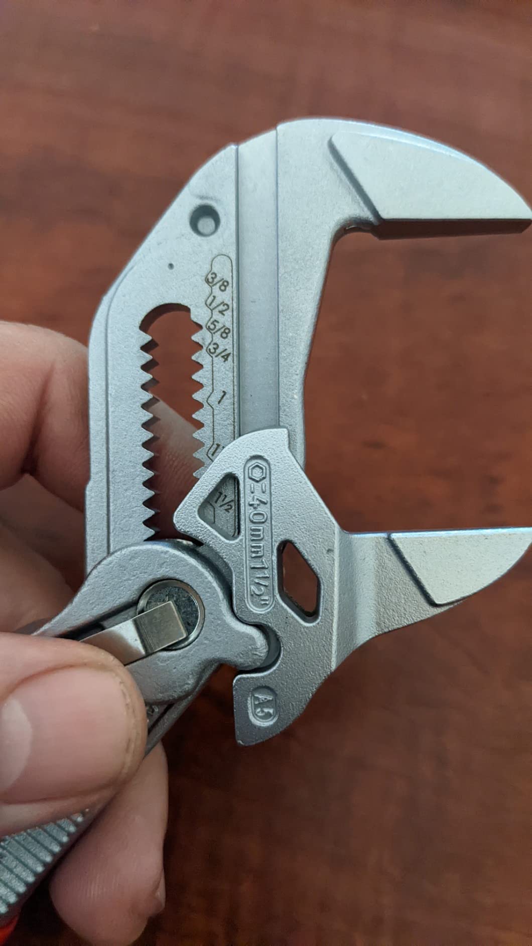 Knipex 9K 00 80 121 US features pliers wrench models 86 03 125 and 86 03 180. The 86 03 125 is 5-inches long with 11 adjustment positions, making it a mini yet mighty tool. It is ideal for every-day-carry (EDC) kits and also for precision mechanics and access to confined spaces. The 86 03 180 is 7 1/4-inches long with 13 adjustment positions and features narrow gripping jaws for fastening/loosening situations that require a slim tool. The 86 03 125 has capacity for nuts up to 7/8-inch and the 86 03 180 has capacity for nuts up to 1 3/8-inch.