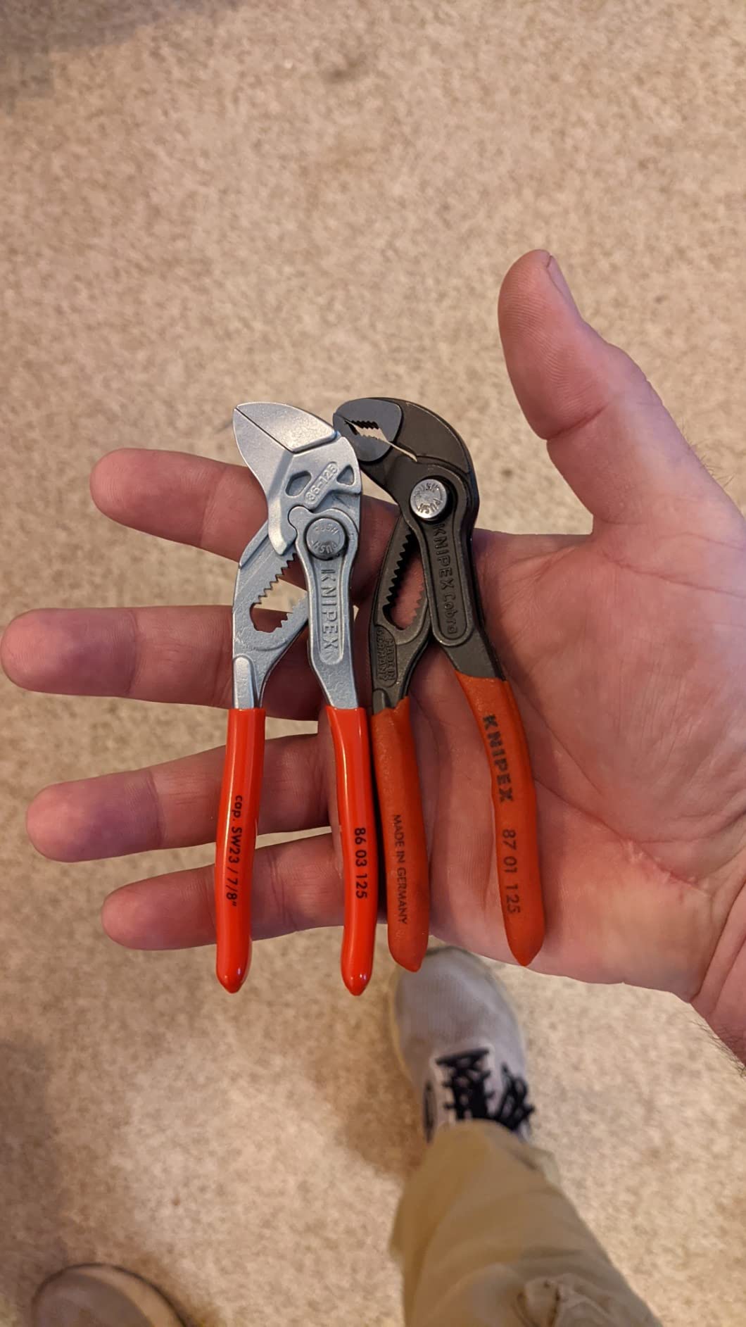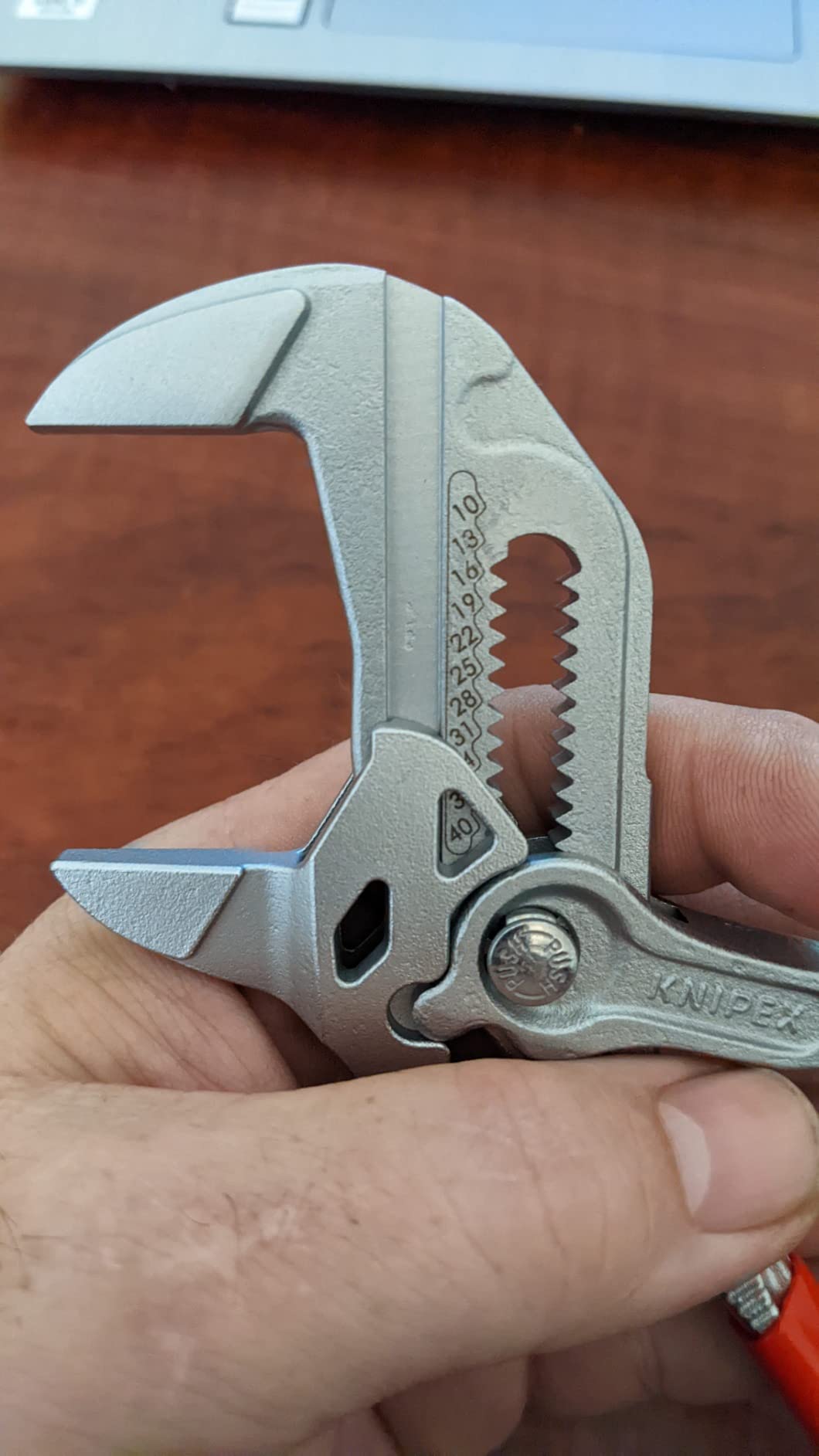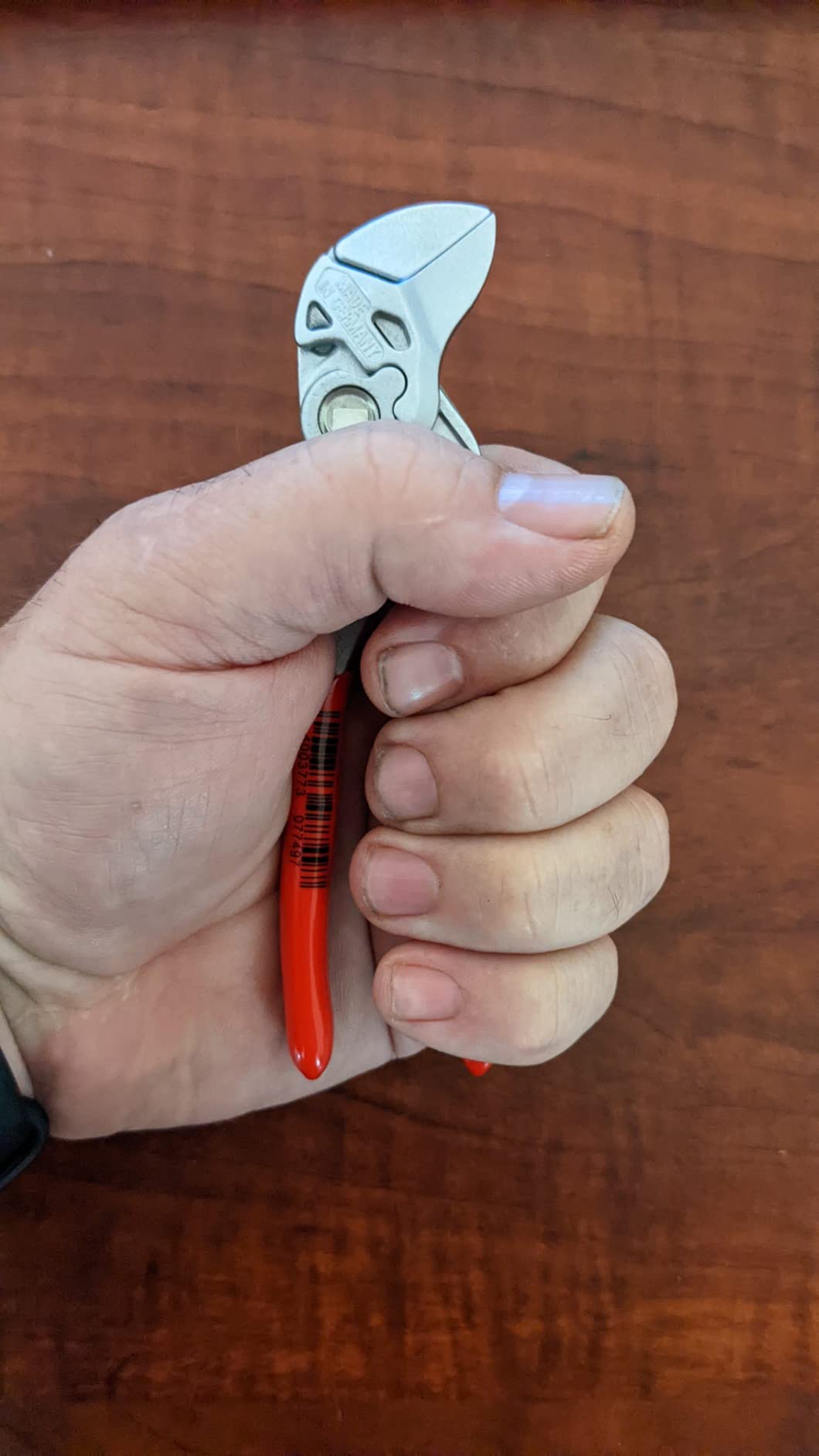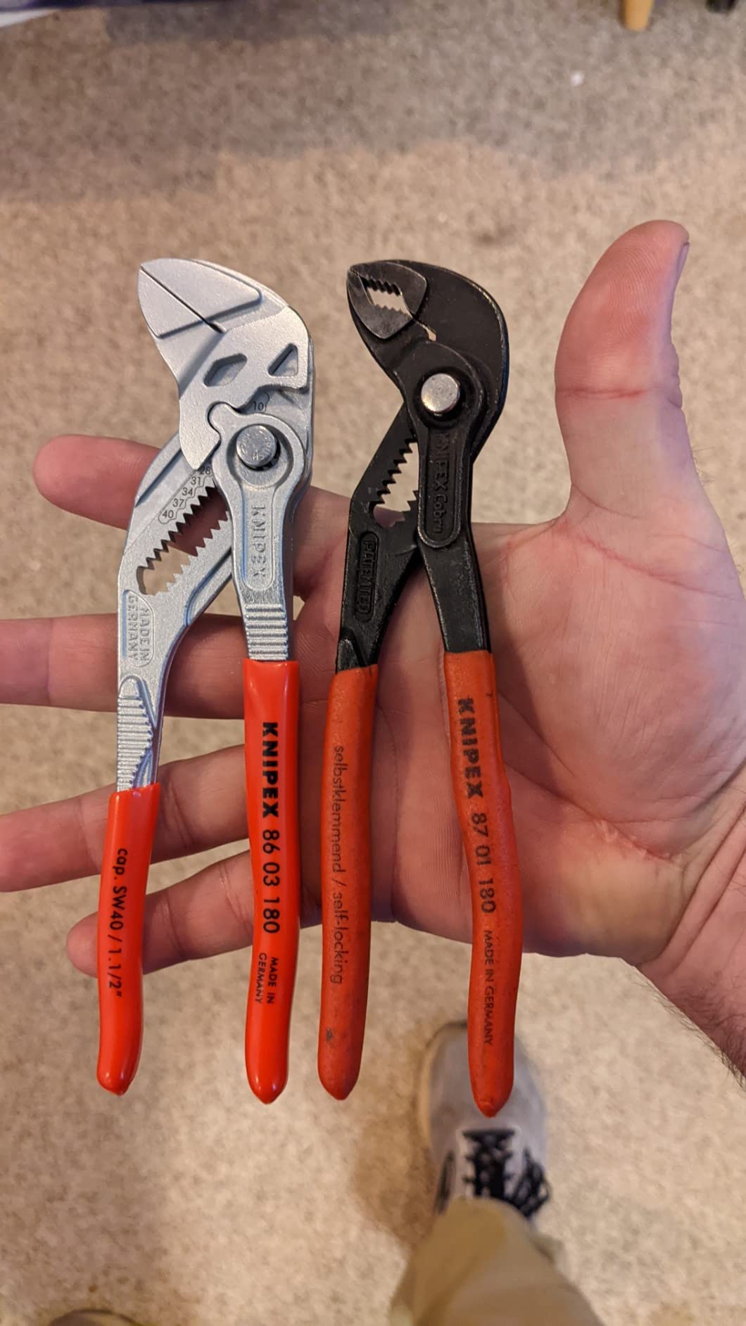 Knipex 9K 00 80 121 US features pliers wrench models 86 03 125 and 86 03 180. The 86 03 125 is 5-inches long with 11 adjustment positions, making it a mini yet mighty tool. It is ideal for every-day-carry (EDC) kits and also for precision mechanics and access to confined spaces. The 86 03 180 is 7 1/4-inches long with 13 adjustment positions and features narrow gripping jaws for fastening/loosening situations that require a slim tool. The 86 03 125 has capacity for nuts up to 7/8-inch and the 86 03 180 has capacity for nuts up to 1 3/8-inch.